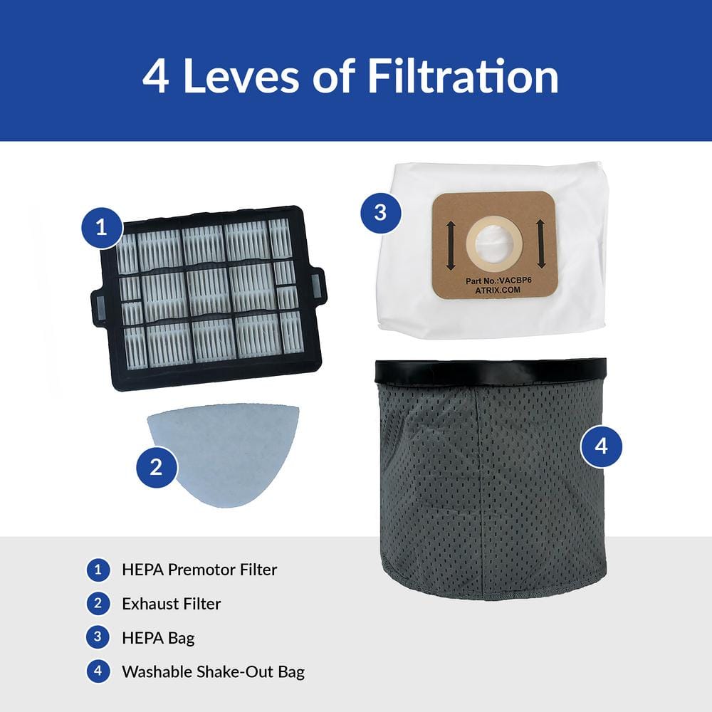 - 4-stage filtration system safely captures dust, dirt, and debris