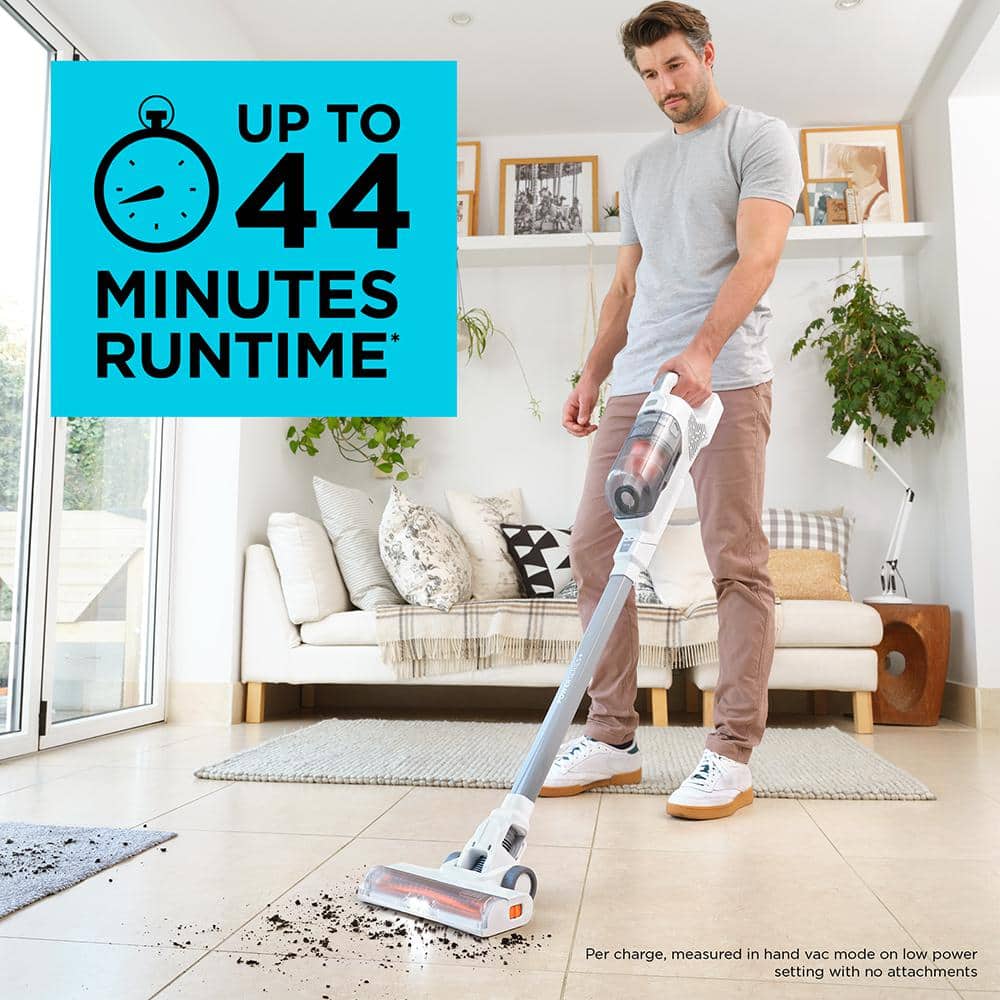 Clean up the big messes and keep your home tidy with the POWERSERIES+ 20-Volt MAX Cordless Stick Vacuum. Made for large spills, you can do more cleaning with up to 25% more pickup on carpet and up to 44-minutes of runtime. Depending on the type of floor, the high-tech POWERSERIES+ vacuum automatically adapts its suction power with AutoSense technology while its cyclonic filtration system helps to keep the filter clean for pro-level performance. Hair, fur, and debris are typically hard to pick up, but the anti-tangle brush bar and integrated LED floor head lights make vacuuming easy. Use the crevice tool and quickly transform it into a handheld vacuum to clean stairs and furniture, lie it flat to vacuum clean under beds and couches, and store when all work is done with this vacuum's convenient, self-standing capability.