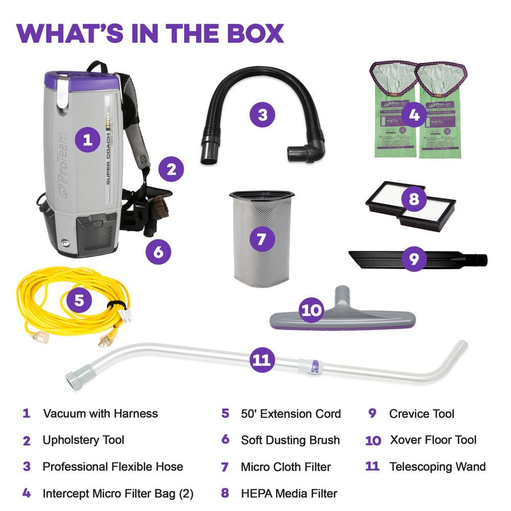 ProTeam Super Coach Pro 10, 10 qt. Commercial Backpack Vacuum Cleaner with Xover Multi-Surface and Telescoping Wand Tool Kit