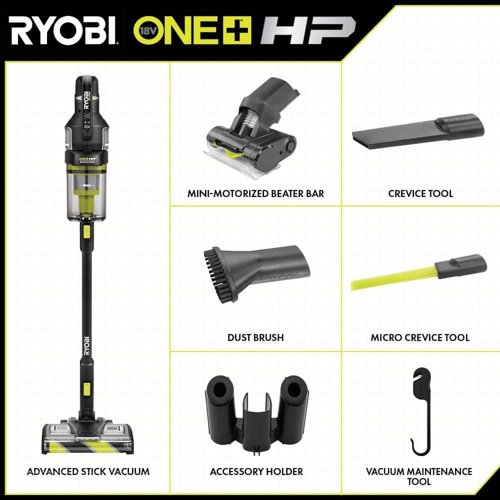 The RYOBI 18V ONE+ HP Advanced Stick Vacuum is our most powerful and quietest vacuum yet, bringing together cutting-edge performance and WHISPER Series Technology for an unparalleled cordless cleaning solution. ONE+ HP Technology delivers more power, runtime, durability and speed utilizing an intelligent brushless motor, advanced electronics and HIGH PERFORMANCE lithium technology for tackling dirt and pet hair. The HEPA Filter captures up to 99.97% of particles down to 0.3 microns and our WHISPER Series Technology ensures quiet operation without compromising on performance. This vacuum is Pet Rated, equipped with a Wrap Defense roller bar design that minimizes hair wrap up to 9" long. The Charging Docking Station conveniently charges your ONE+ battery while providing storage for your vacuum and accessories so it is ready when you are (sold separately). This vacuum adapts to your needs, offering up to 12 cleaning configurations for a comprehensive clean. The mini-motorized beater bar is ideal for cleaning car upholstery, stairs, and furniture. The crevice tool and micro-crevice tool are perfect for cleaning in hard to reach areas while the dust brush is your go-to for delicate surfaces. Illuminate your cleaning path with the LED light. Easily replace your filters and roller bars for uninterrupted performance. Best of all, it is part of the RYOBI ONE+ system where any 18V ONE+ battery works with any 18V ONE+ product. Battery and charger sold separately.