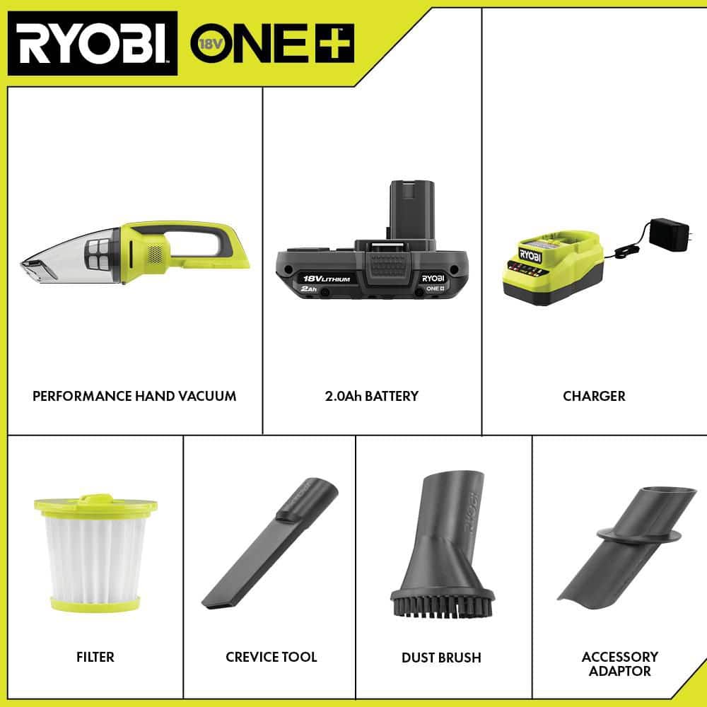 RYOBI introduces the 18V ONE+ Performance Hand Vacuum Kit to our cleaning category. This sleek hand vacuum has a powerful motor that delivers 2X more suction power to pick up a variety of dry debris. Being 25% more compact, this hand vacuum gives users access in hard to reach spaces. The included accessories give users versatility in their cleaning applications. The crevice tool is ideal for cleaning in tight spaces, while the dust brush is gentle for cleaning delicate surfaces. This hand vacuum has an easy to empty dust cup and dual filter system that allows users to quickly clean and maintain their hand vacuum for optimal performance. Best of all, it is part of the RYOBI 18V ONE+ System of over 300 Cordless Products that all work on the same battery platform. This 18V ONE+ Performance Hand Vacuum Kit is backed by the RYOBI 3-Year Manufacturer's Warranty and includes an 18V 2Ah Lithium Battery, Charger, Filter, 1-7/16 in. Accessory Adaptor, Crevice Tool, Dust Brush and Operator's Manuals.