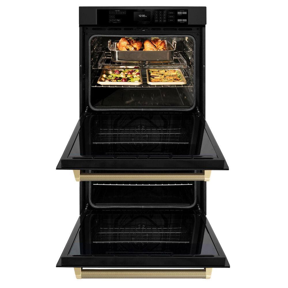 ZLINE Kitchen and Bath Autograph 30 in. True Convection Double Wall Oven with Air Fry in Black Steel with Champagne Bronze Helix Handles