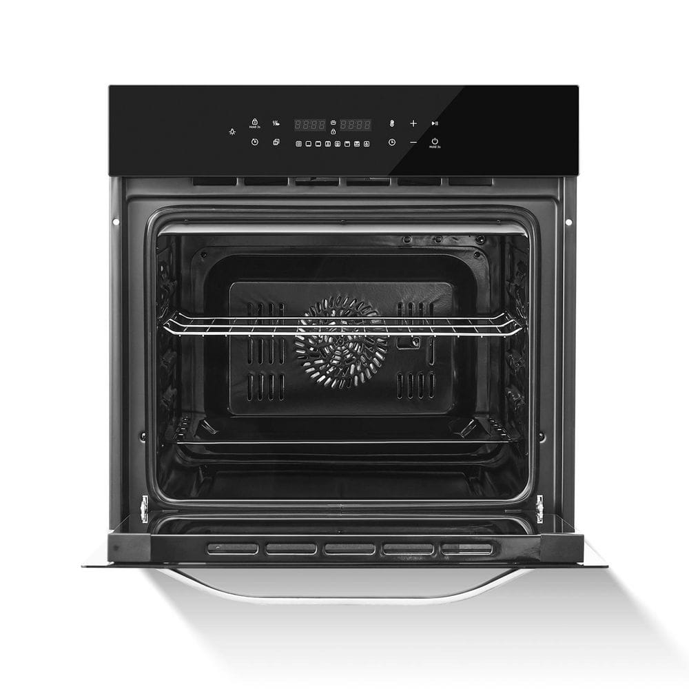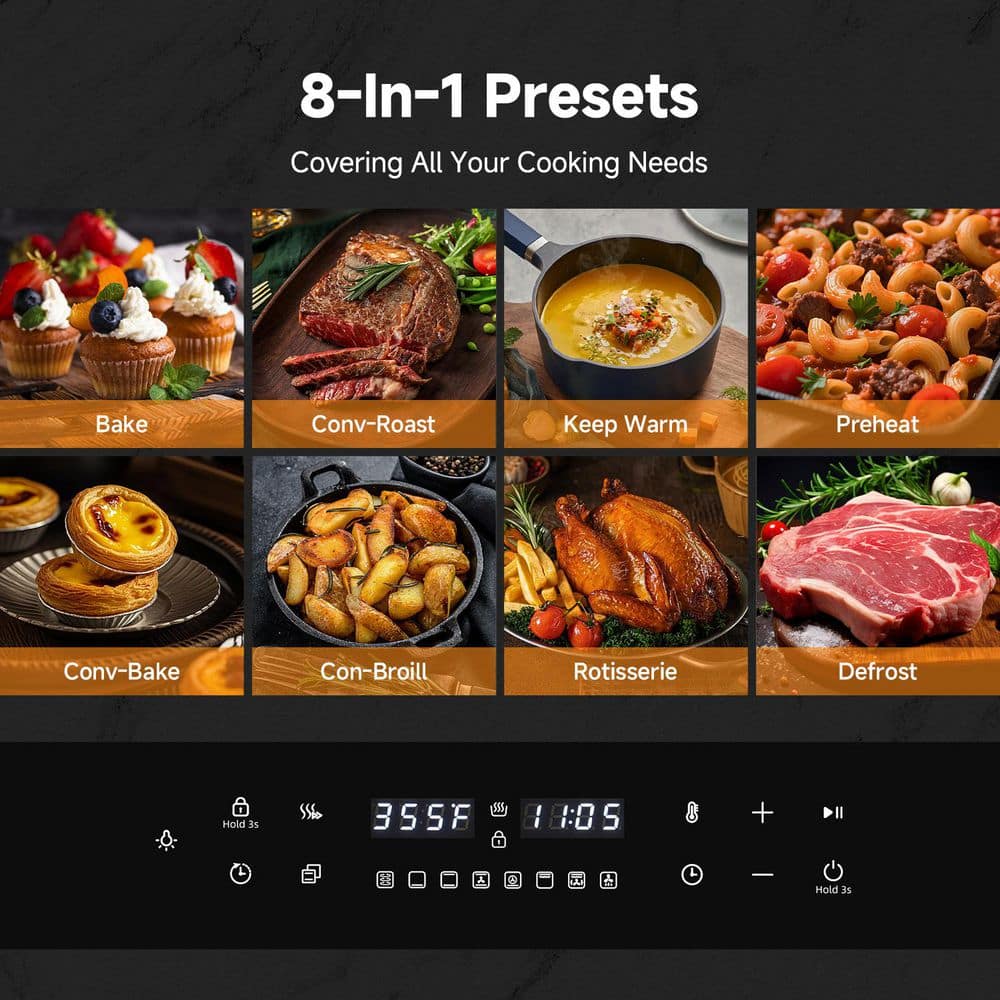 Discover the ultimate kitchen powerhouse with our versatile 77L (2.72 Cu.ft) Electric Oven, designed to elevate your home cooking. Experience professional-grade results with 8 intelligent cooking modes, including a powerful Air Fry function for guilt-free, low-oil meals and a revolutionary 360° Rotisserie that automatically rotates food for even browning and perfectly seared meats. The robust convection system circulates heat efficiently, ensuring fast preheating and uniform cooking every time. Powered by a premium heating system-dual-ring 2800W top, 1000W bottom, and 1000W rear elements-this oven delivers exceptional performance. An integrated sensor probe monitors internal temperatures with precision, going up to 480°F for ideal results. Watch ingredients turn golden-brown through the triple-pane glass door, illuminated by a bright interior LED light. Five adjustable rack positions offer flexible cooking space, ideal for multi-layer baking or roasting. The Built-in Wall Oven with a child lock, removable door that opens 90°, and easy-to-clean interior. Whether it's game day or a family feast, this all-in-one oven brings professional rotisserie, baking, and air frying into your home.