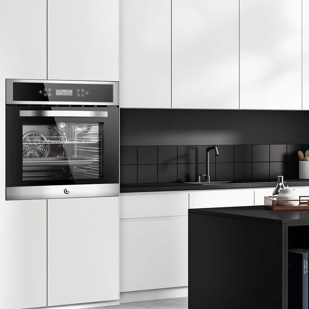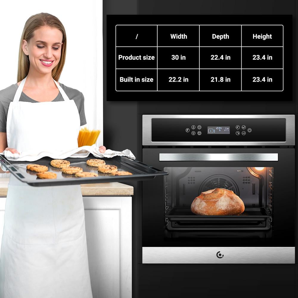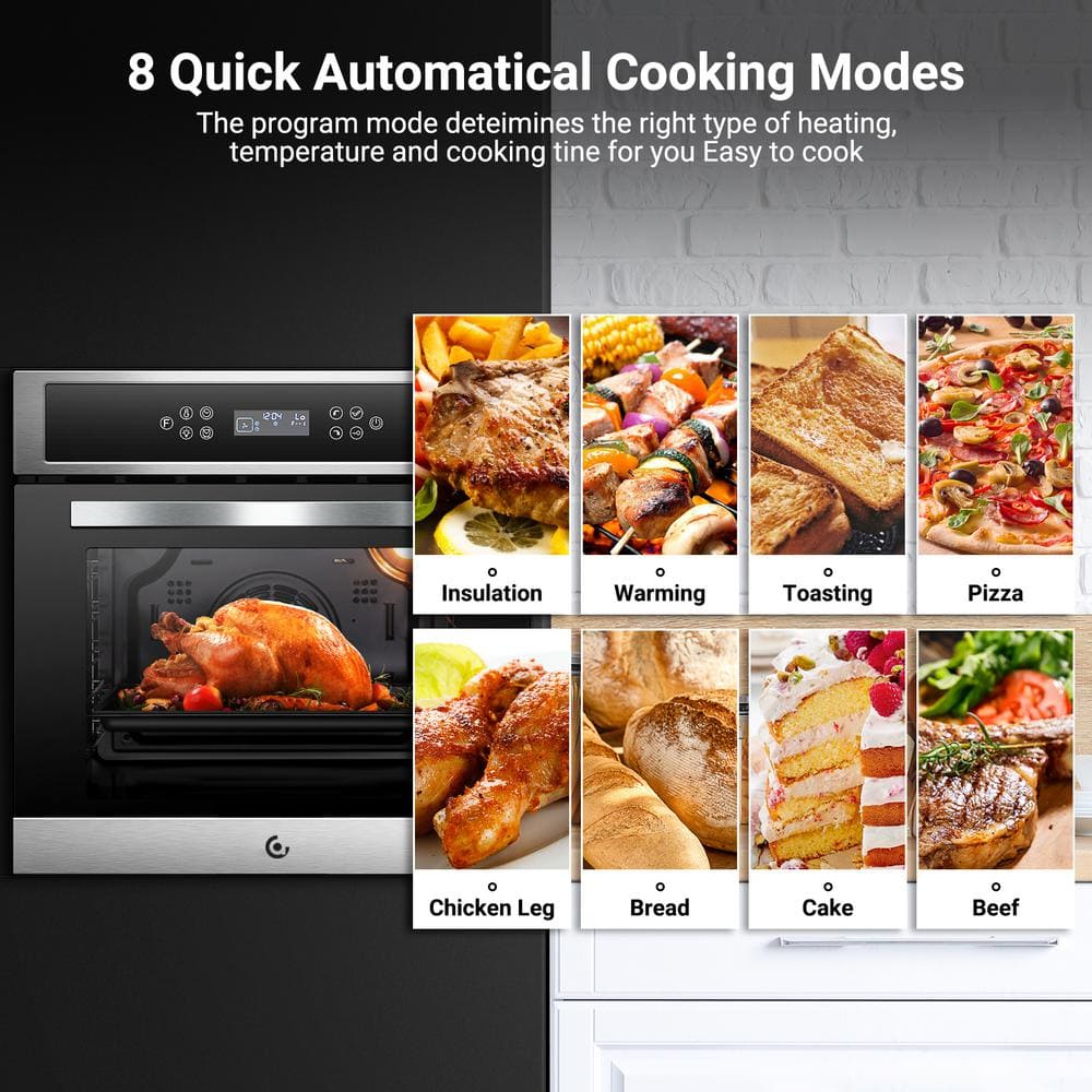This 2.5 cu. ft. built-in wall oven has been very popular since it hit the market. This 24-in. wall oven combines the benefits of a traditional convection oven with those of a more modern fan-assisted model in 1 appliance with a stainless-steel and lacquered front that will captivate you. It works quickly and efficiently, making your meals quicker than conventional oil-based ovens. It can even handle 2 foods at once with ease, reducing mealtime for the family. All you must do is place your prepared food in the basket, select the appropriate function and let the machine do its magic. And the electric wall oven has 8 automatic programming modes for quick start, including heating, baking, pizza, fried chicken, bread, cake, beef. Temperature, time and heating mode are all set. Just touch the desired button and start cooking.