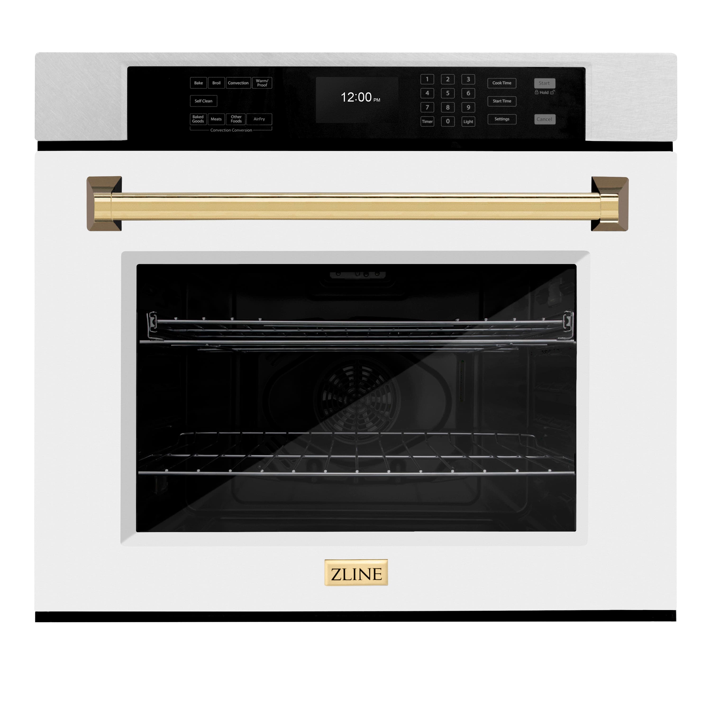 Luxury isn’t meant to be left desired — it’s meant to be attainable. The ZLINE 30 in. Autograph Edition Professional True Convection Single Wall Oven with Air Fry and Self Clean in Satin Stainless Steel with White Matte Door and Polished Gold Handle (WASSZ-WM-30-G) provides a professional culinary experience by pairing reliable, everyday performance with contemporary convection cooking capabilities and cutting-edge air frying technology. Achieve ZLINE Attainable Luxury excellence with innovative features designed to enhance your kitchen’s capability.