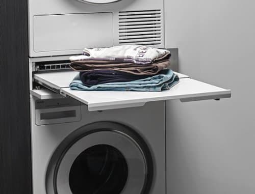 Seamlessly integrating with ASKO washers and dryers, the double shelf disappears behind a push/pull door. It comes with both a removable wire basket and sturdy, telescopic pull-out shelf, aiding in unloading, folding, and carrying of laundry