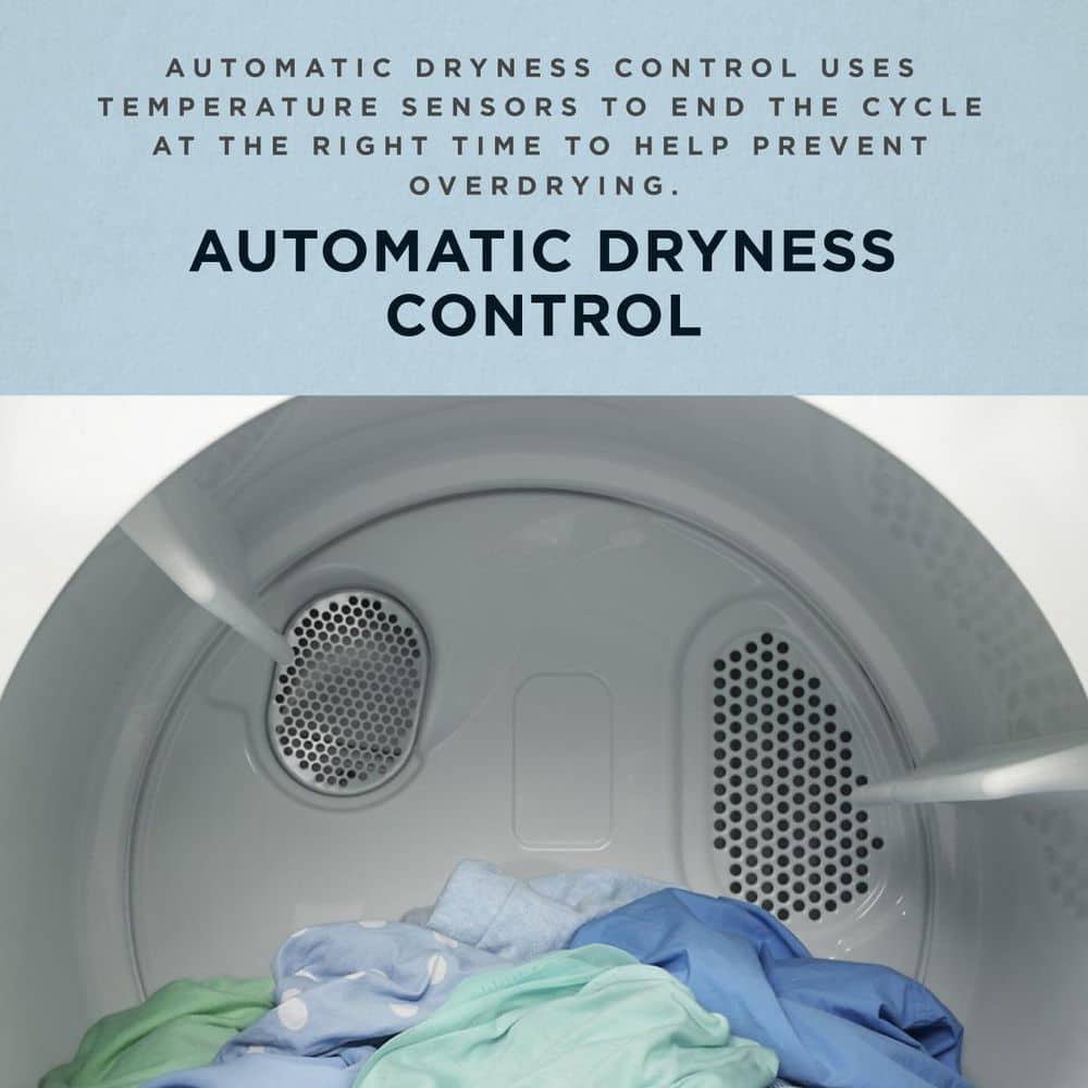 Use only the energy you need with this 6.5 cu. ft. Electric Dryer in white. Equipped with Automatic Dryness Control, it uses sensors that stop the cycle when clothes are dry to help prevent overdrying. Its generous 6.5 cu. ft. capacity means there's plenty of room to dry your loads. When you can't unload right away, the wrinkle prevent option will intermittently tumble your clothes to help keep wrinkles from forming. And drying clothes on your schedule is easy thanks to Timed Dry cycles with up to 60 minutes of operation.
