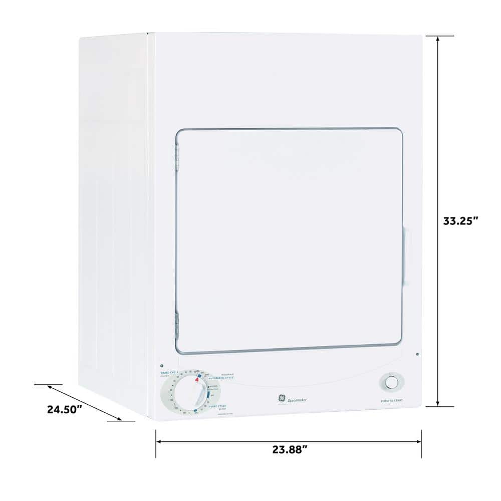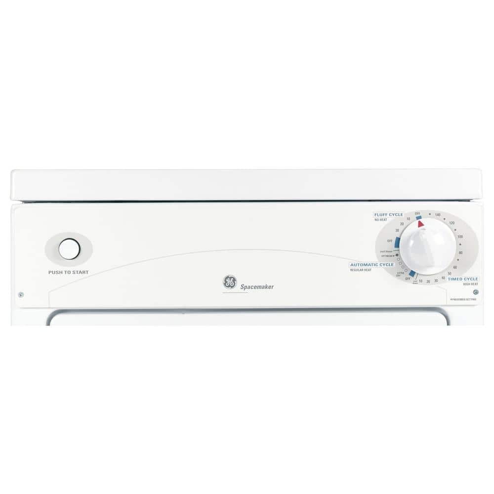 The GE Spacemaker 3.6 cu. ft. Portable Electric Dryer features a sound reduction system to help provide quiet dryer operation. The manual controls offer easy use and the DuraDrum helps provide durability. The dryer features 3 dry cycles and 3 heat selections to help deliver efficient drying results. The dryer features a portable and stackable design to help provide versatility and is UL listed for safety.
