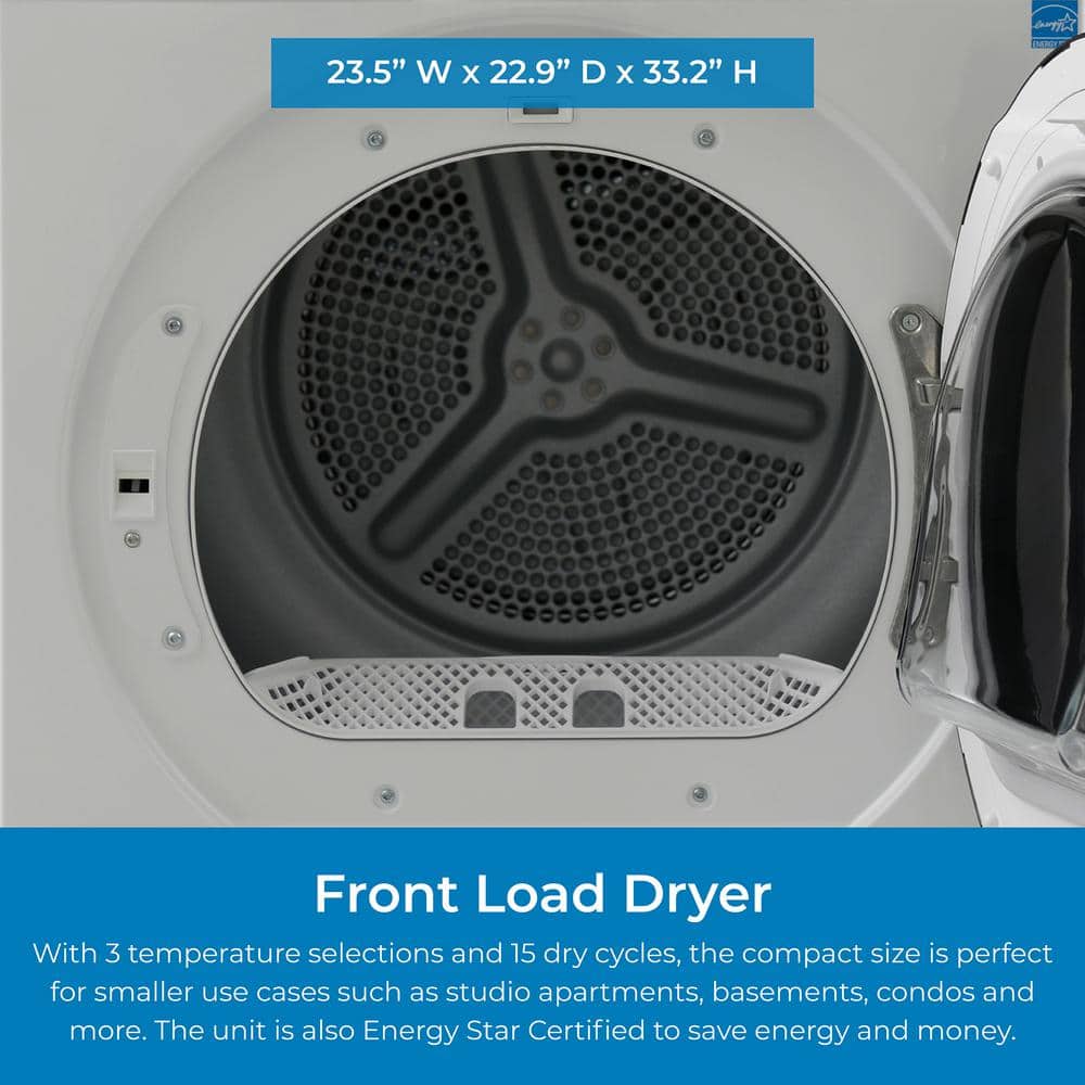 Make laundry time simple and practical with the front load KENMORE Electric Dryer. This dryer machine is designed with 15 dry cycles that will dry everything from soaking wet towels to refreshing a delicate blouse and is large enough to take on almost any sized load with its spacious 4 cubic foot capacity. When you're in a hurry, Express Dry 3 shirts in only 12 minutes or 8 shirts in just 29 minutes. With 3 unique drying temperatures, it's easy to dry all your wet laundry items from a light load of delicates to a mountain of towels or a bulky duvet. The Sanitize Dry Cycle eliminates up to 99.9% of common household germs without the use of chemicals. The 2 way tumbling feature mixes laundry clockwise and counterclockwise for efficient, uniform drying. The convenient drum light shines brightly inside, making it easier to find that missing sock. This powerful dryer measures 23.5 in. W x 22.9 in. D x 33.2 in. H with a reversible door, allowing you to switch the direction your dryer door opens.