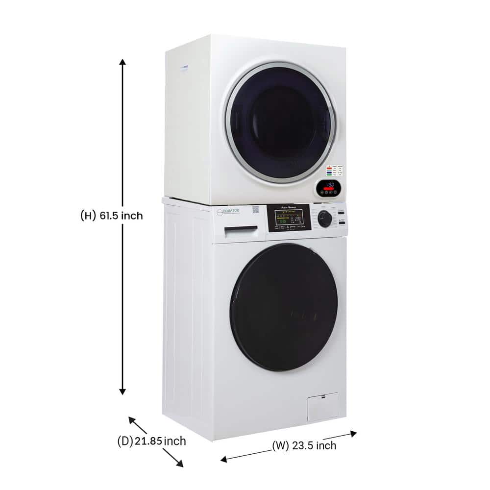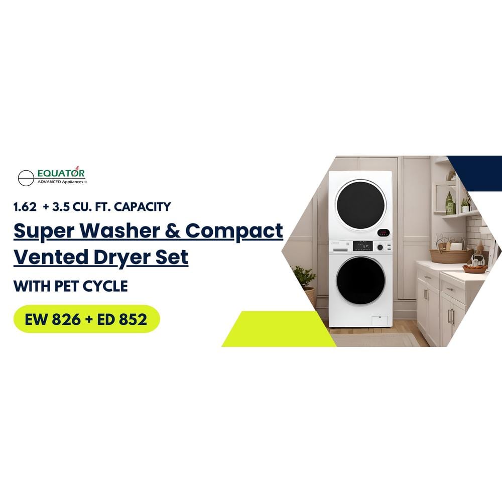 Experience a new level of innovation when doing laundry in any sized space with the Equator 15lbs White Super Washer 3.5 cu. ft. White Compact Short Dryer - Stackable Set. Designed to fit in almost any compact interior - including studio apartments, RVs, tiny homes, and vacation rentals - this curated set is the ultimate laundry solution. The 826 model washer measures 33.5 x 23.5 x 21.85 (HxWxD in in.), and the 852 model dryer measures 28 x 24 x 22 (HxWxD in in.). When stacked as intended, even more space can be saved. You can also save time when running the washer and dryer at the same time. Wash any item with the utmost confidence thanks to this model's impressive 12 custom wash cycles, including ECO, Baby, Delicate, Allergen, and more. Need to eliminate pet hair from fabrics? Do so in no time when using Pet Cycle. Washing and Drying can be done at the same time since both units are separate. Other top features include Foam Control, Child Lock, Touch Buttons, an Anti Bacterial Drum Baffle, and much more. When it is time to dry your clothing and fabrics, enjoy features such as Sensor Dry, Digital Controls, Five Dry Cycles (featuring Hot, Time Dry, and Warm), a Stainless Steel Drum, and a Door Safety Switch.
