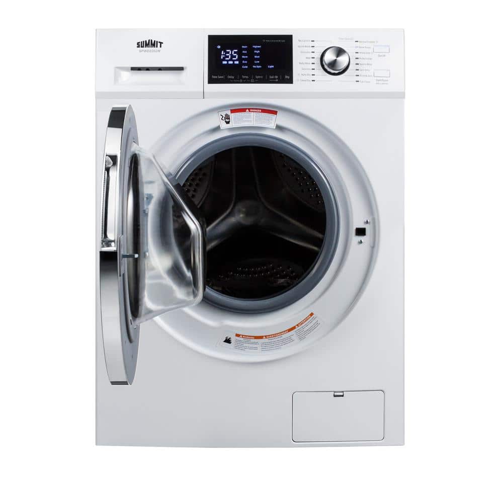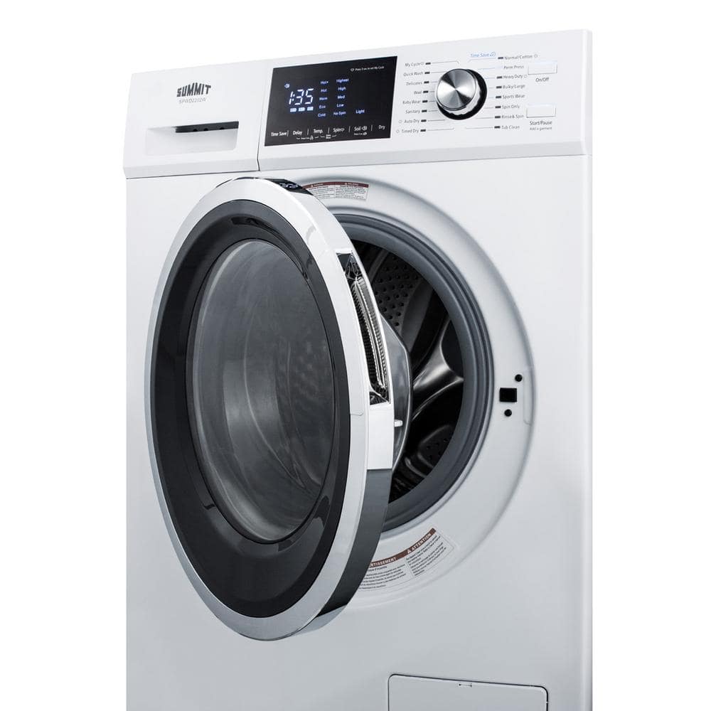Summit SPWD2202W is a 24 in. wide washer/dryer combo designed to maximize laundry capacity in an easy fit.This non-vented condensing (ductless) 115V washer/dryer comes in a classic white finish. The stainless steel drum offers a generous 2.7 cu.ft. capacity to accommodate larger laundry loads than previous versions of this unit. The front-loading design features a large, easy-to-open glass door and pull-out dispenser for detergent, pre-wash, and fabric softener. A combination digital and dial control panel with a large LCD readout makes it easy and intuitive to operate this unit.The SPWD2202W includes 16 wash programs to ensure all fabrics receive the proper treatment. Settings include specialized programs for cotton, permanent press with de-wrinkling, heavy duty, bulky/large loads, sportswear, babywear, wool, delicates, and more.A in.Sanitize in. cycle allows the washer to use higher temperatures for smaller loads, while a in.Quick in. setting is ideal for washing small loads in less time. For improved maintenance, this combo includes a in.tub clean in. cycle. Five spin speeds up to 1300 RPM help to provide the right level of spin for each dry cycle. This unit offers the choice of four temperature settings and three soil levels, as well as a memory function ( in.My Cycle in.) for added convenience.With its quality performance, large capacity, and attractive design, the SPWD2202W brings true value and efficiency to laundry in space-challenged settings.