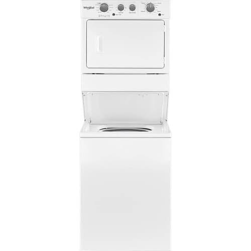 Create a laundry center in a smaller space with this 27.25-inch Whirlpool stacked washer and dryer. Its high-efficiency agitator thoroughly cleans each load, and its AutoDry system automatically senses when fabrics are free of moisture to save energy. The 5.9 cu. ft. dryer capacity of this Whirlpool stacked washer and dryer provides plenty of room for handling bulky items.